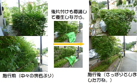 生垣が伸びきって、通行される方の邪魔になっていませんか?お隣にかぶって気になっていることはないでしょうか。太くなってしまった枝の処分などお困りではないでしょうか。まめに手入れすることできれいに保てます。でも、時間がないという方、お手伝いします。DIYレベルですが(プロの植木職人ではないです)、自宅の庭いじりの経験を踏まえて刈らしていただきます。