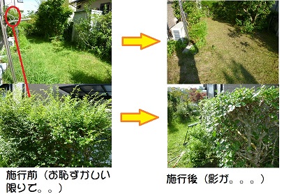 雨等でタイミングを逃すと一気にひどいことになりますね。季節によっては虫も付き始めます。切るのは案外さっとできますが後片付けは思ってるより大変です。防虫剤の散布も承ります。ただ、住宅街では場所・風向きなどで周りのかたへの影響を考慮する必要があります。防虫剤はわざと臭いをつけているものが多いのでこの点も要注意ですね。